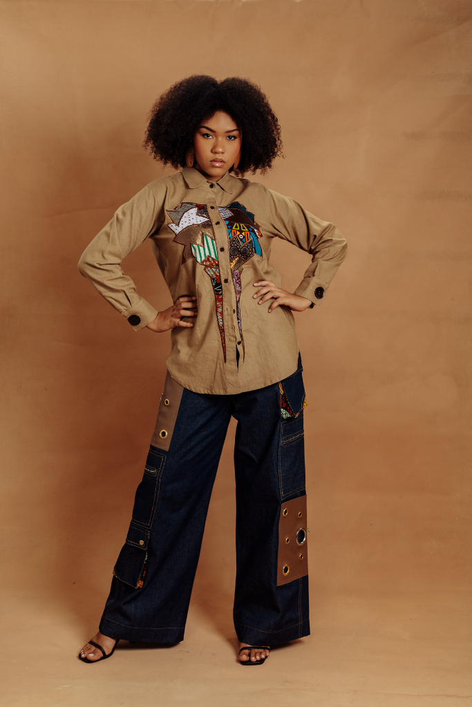 Crafted from Breathable linen in a soft beige Tone, This Shirt is elevated by a stunning fabric mosaic embroidered across the front. Wooden button add warmth and character, with extra-large wooden buttons on the cuffs to create a statement detail.