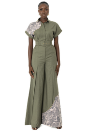 Elevate your wardrobe with this stunning linen jumpsuit, proudly made in Ghana, adorned with elegant gold accents. The jumpsuit boasts a graceful press button fastening at the front, enhanced by a matching waist belt for a flattering silhouette.